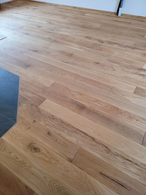Massivholzdielen aus Eiche mit fest verwachsenen Ästen bis ca. 3,5 cm. Auf der Oberseite geringe Splintanteile möglich. Dielen mit natürlichem, farbharmonischem Erscheinungsbild.